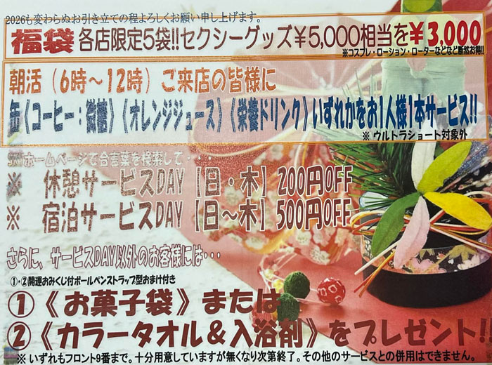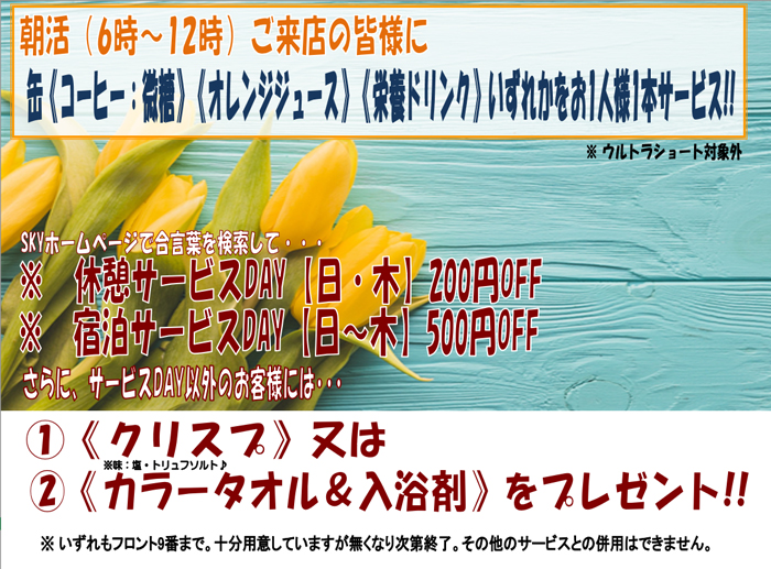 宿泊:\6,500(平日・日・祝)/\8,500(土・祝前日)