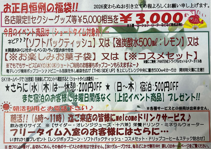 宿泊:\7,000(平日・日・祝)/\8,500(土・祝前日)