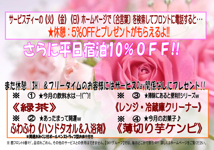 宿泊:\7,300(平日・日・祝)/\9,200(土・祝前日)